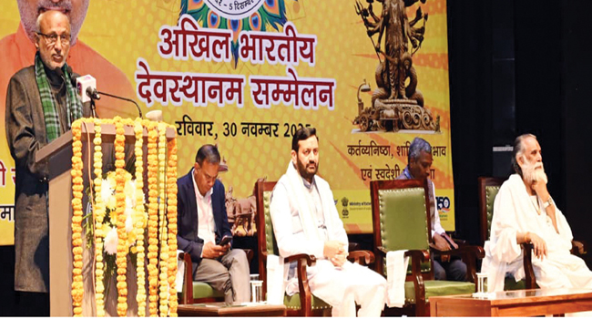 चंडीगढ़ – भारत के उपराष्ट्रपति सी.पी. राधाकृष्णन ने हरियाणा के कुरुक्षेत्र में अंतर्राष्ट्रीय गीता महोत्सव 2025 से इतर आयोजित अखिल भारतीय देवस्थानम सम्मेलन में मुख्य अतिथि के रूप में भाग लिया। इस अवसर पर हरियाणा के मुख्यमंत्री नायब सिंह सैनी, गीता मनीषी स्वामी ज्ञानानंद जी महाराज और अन्य गणमान्य व्यक्ति उपस्थित थेइस अवसर पर बोलते हुए, उपराष्ट्रपति ने कहा कि वह “वेदों की भूमि” कुरुक्षेत्र की पावन धरती पर खड़े होकर अत्यंत सम्मानित महसूस कर रहे हैं। उन्होंने कहा कि यह पवित्र स्थान हजारों वर्षों से इस स्थान के रूप में पूजनीय है जहाँ भगवान श्री कृष्ण ने अर्जुन को भगवद् गीता का दिव्य ज्ञान प्रदान किया था। उन्होंने कहा कि कुरुक्षेत्र हमेशा याद दिलाता है कि धर्म अंततः अधर्म पर विजय प्राप्त करता है, चाहे अधर्म कितना भी शक्तिशाली क्यों न हो।