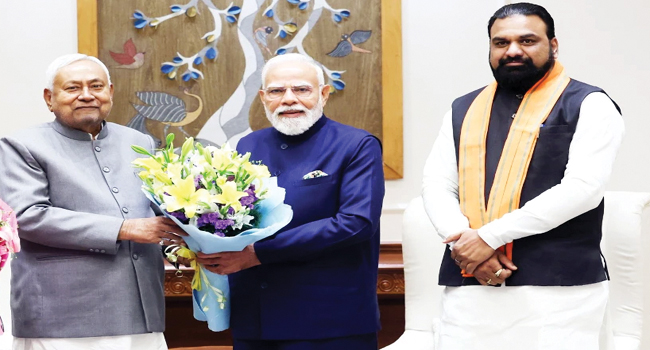 नई दिल्ली। मुख्यमंत्री नीतीश कुमार ने सोमवार को दिल्ली में प्रधानमंत्री नरेंद्र मोदी से मुलाकात की। यह मुलाकात करीब 30 मिनट तक चली, जिसमें कई अहम राजनीतिक और प्रशासनिक मुद्दों पर चर्चा हुई। मुलाकात के दौरान मुख्यमंत्री नीतीश के साथ केंद्रीय मंत्री ललन सिंह और बिहार के उपमुख्यमंत्री सम्राट चौधरी भी मौजूद रहे। तीनों नेता एक ही वाहन से प्रधानमंत्री आवास पहुंचे थे, जिससे इस मुलाकात को राजनीतिक दृष्टि से काफी महत्वपूर्ण माना जा रहा है। गौरतलब है कि मुख्यमंत्री नीतीश कुमार रविवार को पटना से दिल्ली पहुंचे थे। बिहार विधानसभा चुनाव में भारी जीत के बाद यह उनका पहला दिल्ली दौरा है। ऐसे में इस मुलाकात को एनडीए के भीतर समन्वय और आगामी रणनीति से जोड़कर भी देखा जा रहा है।