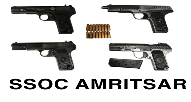 चंडीगढ़/अमृतसर: मुख्यमंत्री भगवंत सिंह मान के दिशा-निर्देशों के अनुसार पंजाब को सुरक्षित राज्य बनाने के लिए चलाई गई मुहिम के दौरान बड़ी सफलता हासिल करते हुए स्टेट स्पेशल ऑपरेशन सेल (एसएसओसी) अमृतसर ने चार मुख्य गुर्गों को गिरफ्तार कर सीमा पार से चल रहे तस्करी नेटवर्क का पर्दाफाश किया है। इस दौरान उनके कब्जे में से चार आधुनिक .30 बोर स्टार मार्क पिस्तौलों के साथ-साथ गोला-बारूद भी बरामद किए गए हैं। यह जानकारी पंजाब के पुलिस महानिदेशक (डीजीपी) गौरव यादव ने यहां दी।