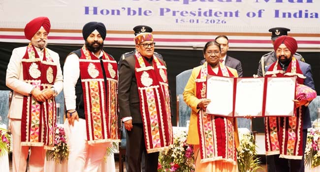 चण्डीगढ़ : राज्यसभा सांसद पद्मश्री डॉ. विक्रमजीत सिंह साहनी को गुरु नानक देव विश्वविद्यालय, अमृतसर के स्वर्ण जयंती दीक्षांत समारोह के अवसर पर भारत की माननीय राष्ट्रपति द्वारा मानद डॉक्टरेट की उपाधि से सम्मानित किया गया। यह मानद डॉक्टरेट डॉ. साहनी को पंजाब में उनके प्रभावशाली सामाजिक योगदान के लिए प्रदान की गई, विशेष रूप से बाढ़ राहत एवं पुनर्वास, नशा मुक्ति तथा उनके द्वारा बड़े पैमाने पर किए जा रहे रोजगार सृजन और कौशल विकास के कार्यों के लिए। हालिया पंजाब बाढ़ के दौरान उनके द्वारा बड़े पैमाने पर राहत बचाओ एवं पुनर्वास का काम किया गया, वे पंजाब में नशा मुक्ति के लिए सतत कार्यरत है, तथा हजारों युवाओं को रोजगारोन्मुख कौशल प्रदान करने हेतु उनके द्वारा विश्वस्तरीय स्किल सेंटरों की स्थापना ने आजीविका बहाली और युवा सशक्तिकरण में उल्लेखनीय योगदान दिया है।