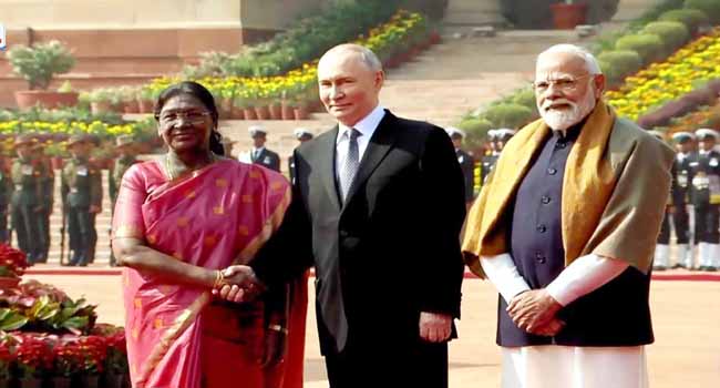 नई दिल्ली। रूस के राष्ट्रपति व्लादिमीर पुतिन शुक्रवार सुबह राष्ट्रपति भवन में आयोजित औपचारिक समारोह में शामिल हुए, जहां उनका स्वागत 21 तोपों की सलामी और गार्ड ऑफ ऑनर के साथ किया गया। राष्ट्रपति भवन के प्रांगण में राष्ट्रपति द्रौपदी मुर्मू और प्रधानमंत्री नरेंद्र मोदी ने पुतिन का स्वागत किया।
