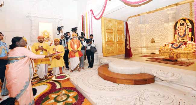 इस अवसर पर राज्यपाल आनंदीबेन पटेल, मुख्यमंत्री योगी आदित्यनाथ, उपमुख्यमंत्री ब्रजेश पाठक और केशव प्रसाद मौर्य सहित कई गणमान्य उपस्थित रहे। एयरपोर्ट से निकलकर राष्ट्रपति ने जगतगुरु आद्य शंकराचार्य द्वार से रामनगरी में प्रवेश किया। राम मंदिर पहुंचने के बाद राष्ट्रपति ने सबसे पहले रामलला के दर्शन किए और मंदिर परिसर का अवलोकन किया। इस दौरान मुख्यमंत्री योगी आदित्यनाथ ने उन्हें मंदिर निर्माण से जुड़े विभिन्न पहलुओं की जानकारी दी।
