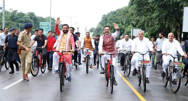 चंडीगढ़: हरियाणा के मुख्यमंत्री नायब सिंह सैनी ने आज एक अनोखा उदाहरण पेश किया। वह एमएलए हॉस्टल से साइकिल चलाकर विधानसभा पहुंचे। इस दौरान उनके स्पीकर हरविंदर कल्याण, मंत्रिमंडल के सदस्य और कई विधायक भी साइकिल यात्रा में शामिल हुए। यह पहल नशामुक्ति और पर्यावरण संरक्षण को बढ़ावा देने के उद्देश्य से विधानसभा की तरफ से आयोजित की गई थी। सीएम नायब सिंह सैनी ने कहा कि व्यायाम से इंसान एक्टिव रहता है। प्रधानमंत्री नरेंद्र मोदी का आह्वान है ‘फिट इंडिया, स्वस्थ इंडिया’। जब हम योग और व्यायाम करेंगे तो स्वस्थ रहेंगे और जब स्वस्थ रहेंगे तो विकास की रफ्तार भी तेज होगी।