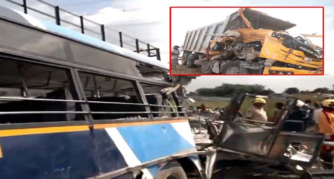 रंगारेड्डी। तेलंगाना के रंगारेड्डी जिले में सोमवार सुबह एक सड़क हादसे में 24 लोगों की मौत हो गई, कई अन्य घायल भी हुए हैं। यह दुर्घटना उस समय हुई जब गिट्टी से भरे एक तेज रफ्तार डंपर ने राज्य परिवहन निगम की बस को जोरदार टक्कर मार दी। हादसे के बाद बस बुरी तरह क्षतिग्रस्त हो गई और डंपर पर लदी गिट्टी बस के अंदर यात्रियों पर गिर गई, जिससे कई लोग गिट्टी के नीचे दब गए।मीडिया रिपोर्ट में पुलिस के हवाले से बताया गया है कि आरटीसी बस तंदूर से हैदराबाद जा रही थी। बस में 70 से ज्यादा यात्री सवार थे, जिनमें कॉलेज के छात्रों ज्यादा थे।